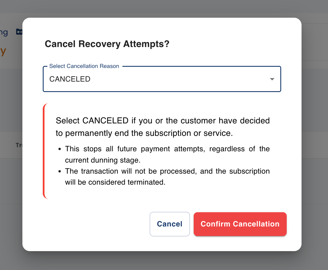 Available on the Dunning Activity detail view only when a session is In Recovery. Click the Cancel Recovery Attempts to stop further retries for that session. This complements the existing view of session status, attempt count, and history.