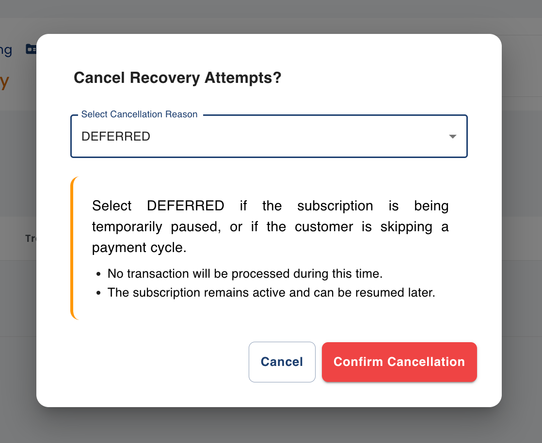 | DEFERRED | The subscription is temporarily paused, or the customer is skipping a payment cycle. | No transaction will be processed during this time. The subscription remains active and can be resumed later. | ![]() |