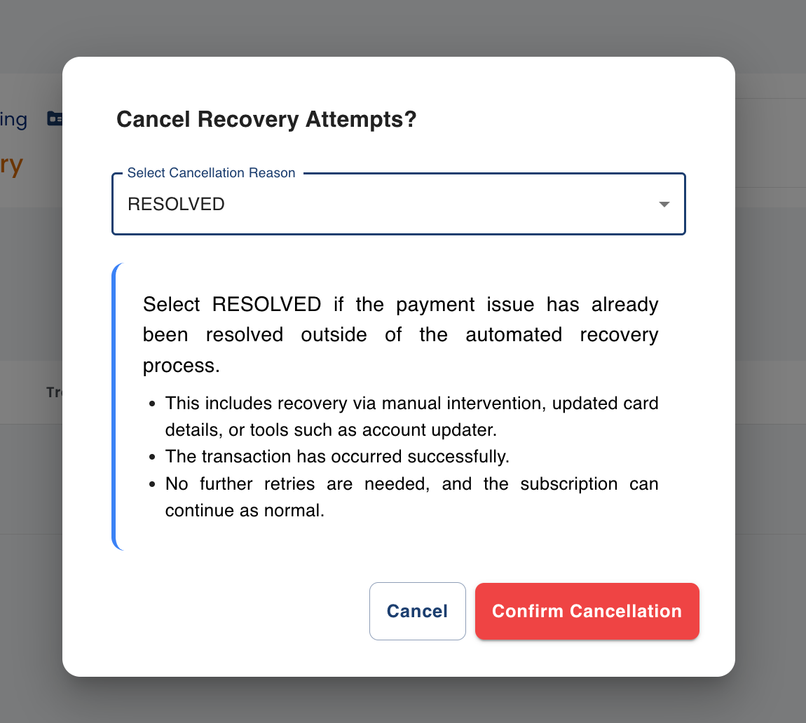 - Analytics and history reflect the chosen cancellation reason, so you can report on why retries were stopped.